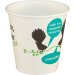 Eco single wall hot cup. Fits Vegware's 72-Series lids. For espresso or small speciality coffee, hot dipping sauces and any hot sampling. Sustainable board with a plant-based PLA lining. Crisp white, with Vegware messaging in green. Award-winning quality by Vegware, made from plants.