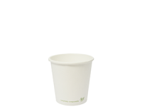 Eco single wall hot cup. Fits Vegware's 62-Series lids. For espresso or small speciality coffee, hot dipping sauces and any hot sampling. Sustainable board with a plant-based PLA lining. Crisp white, with Vegware messaging in green. Award-winning quality by Vegware, made from plants.