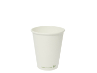 Eco single wall hot cup. Fits Vegware's 89-Series lids. For coffee, tea and all hot drinks, or soup to go. Also ideal portion control for chips or fried treats. Sustainable board with a plant-based PLA lining. Crisp white, with Vegware messaging in green. Award-winning quality by Vegware, made from plants.