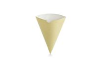 Cone kraft. (being discontinued - use TK01NPCONE once sold out, as alternative) Paper cones for chips, churros, fried bites, chestnuts, pretzels or any hot treats to go.. Leak-proof ergonomic cone with a grease-resistant lining. Sustainable card. Brown kraft colour. Award-winning quality by Vegware, made from plants, not plastic.