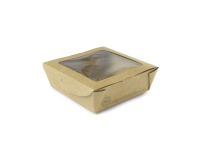 Box window medium 650ml 12 x 12 x 4.5cm. Square eco card box with a window. Ideal for cold salads, cakes or bites to go. Also perfect for afternoon teas. Sustainable board with a plant-based PLA window. Brown kraft card. Award-winning quality by Vegware, made from plants. Commercially compostable where accepted.