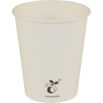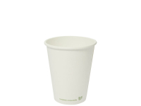 Eco single wall hot cup. Fits Vegware's 89-Series lids. For coffee, tea and all hot drinks, or soup to go. Also ideal portion control for chips or fried treats. Sustainable board with a plant-based PLA lining. Crisp white, with Vegware messaging in green. Award-winning quality by Vegware, made from plants.